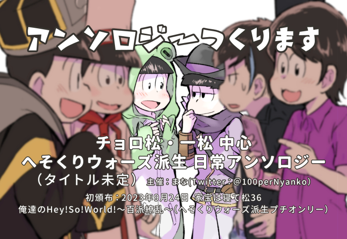 年中松中心 へそウォ派生 日常アンソロジー(おそ松さん/へそウォ二次創作)を発行しました。 ■タイトル:ほぼほぼ一年中 ■発行予定日:2023年9月24日(家宝は寝て松36、俺達のHey!So!World!~百派繚乱~) ■主催:まな(@100perNyanko) ■弊アンソロジーはファンによる二次創作、および非公式企画です 各公式作品様、各関係者様、各公式企画様とは一切関係ありません