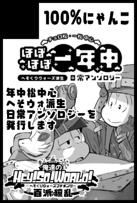 年中松中心 へそウォ派生 日常アンソロジー(おそ松さん/へそウォ二次創作)を発行しました。 ■タイトル:ほぼほぼ一年中 ■発行予定日:2023年9月24日(家宝は寝て松36、俺達のHey!So!World!~百派繚乱~) ■主催:まな(@100perNyanko) ■弊アンソロジーはファンによる二次創作、および非公式企画です 各公式作品様、各関係者様、各公式企画様とは一切関係ありません